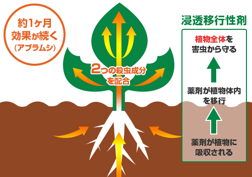 ■特長 浸透移行性の殺虫成分を2種類配合 土にばらまくだけで植物に吸収され、植物全体を害虫から守る予防的効果※が約1ヵ月(アブラムシ)続きます。